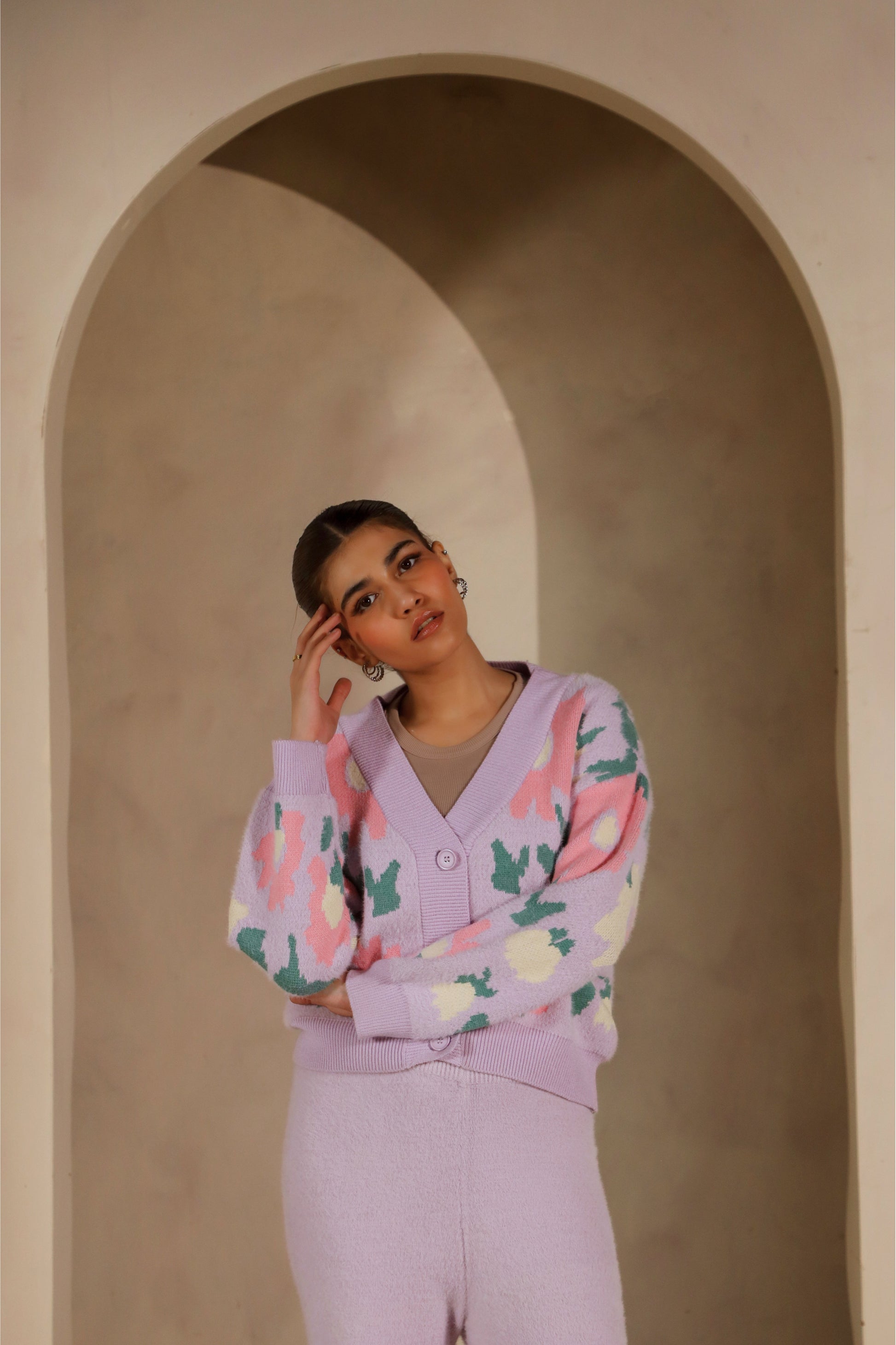 Indulge in unmatched comfort with the Lavende Cardigan, a dreamy blend of softness and style. Crafted from a fur-like plush fabric, this pastel lavender piece feels as cozy as it looks. The cardigan is adorned with a charming floral pattern in pastel tones, adding a playful yet elegant touch. Featuring a relaxed fit, button-down front, and ribbed trims, it’s perfect for layering on cooler days. Whether paired with casual loungewear or styled for a chic outing, the Lavende Cardigan promises effortless warmth and timeless appeal.