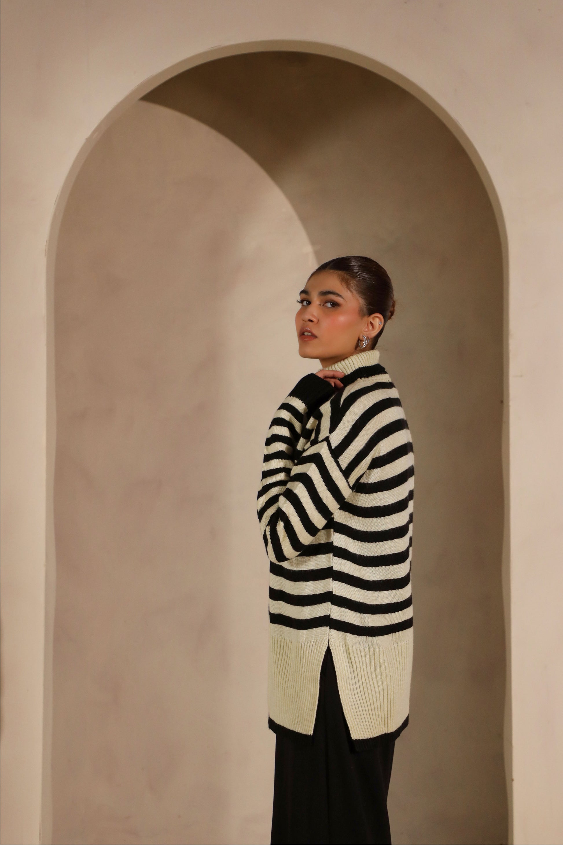 The Luna sweater stands out for its sophisticated blend of simplicity and boldness, making it a must-have for any wardrobe. Crafted from a high-quality knit material, it provides a soft and comfortable feel, ensuring warmth during cooler seasons. Its monochrome black-and-white stripes exude a Parisian-inspired elegance, while the slightly oversized fit offers a contemporary and relaxed vibe. The turtleneck design not only adds extra warmth but also gives a polished finish, making it suitable for both casual outings and more refined settings. The sweater features dropped shoulders, emphasising its laid-back charm, while the ribbed detailing at the hemline, cuffs, and neckline adds a touch of structure to the overall silhouette.