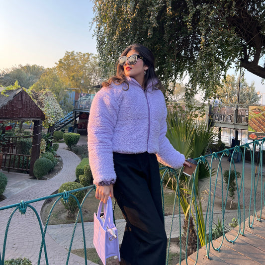 A dreamy blend of softness and style. Crafted from a fur-like plush fabric, this pastel lavender piece feels as cozy as it looks!