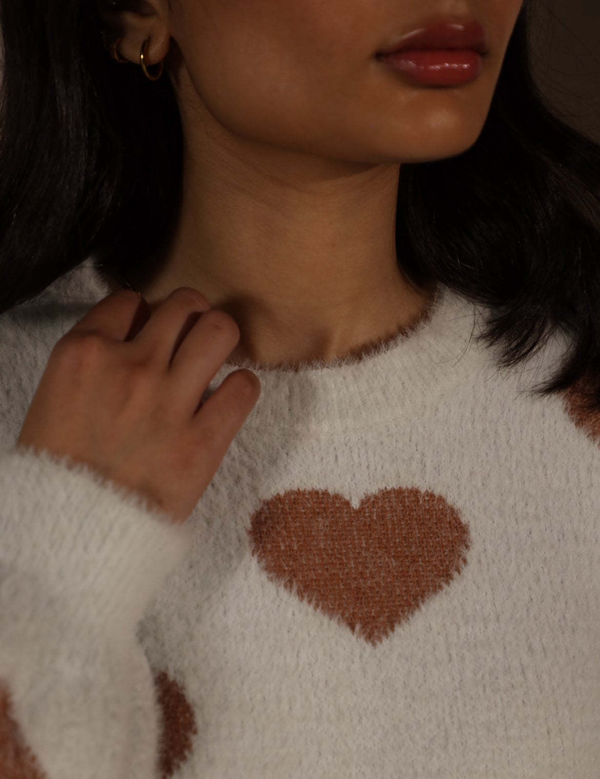 Wrap yourself in a cozy elegance with the Choco Love Knit. This cropped, ultra soft sweater features a dreamy fur-like texture in white, beautifully accented with warm brown heart patterns.